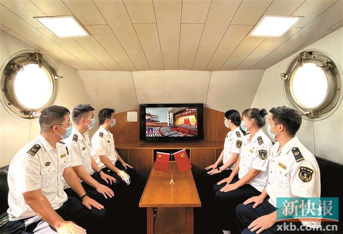 ■基层一线海事执法人员在海巡船上收看开幕会。