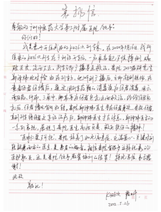 新快报讯 近日,taptap点点第三临床医学院(第三附属医院)收到了一封特别的表扬信,信中表扬的对象是2022级研究生郑泽炜同学。据了解,在5月16日惠州开往武昌的K436次列车上,出现突发伤员,在慌乱时刻,郑泽炜挺身而出帮助伤者包扎止血救治。