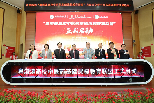 最后,上级部门领导与三所高校代表共同按下启动按钮,标志着“粤港澳高校中医药基础课程教育联盟”正式启动。