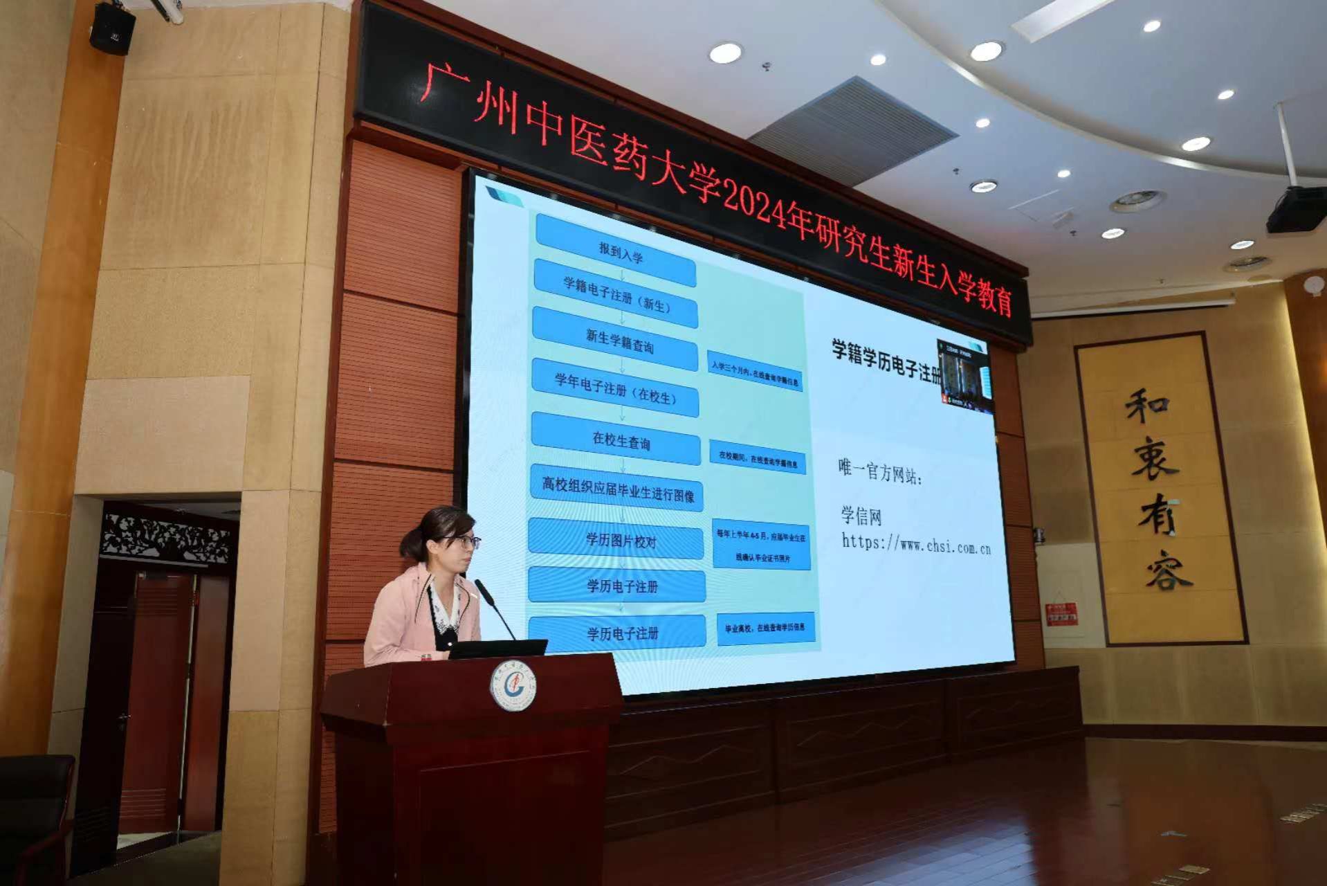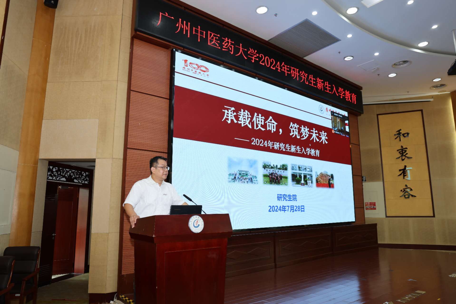 副校长刘中秋对2024级研究生新生的到来表示热烈欢迎。他强调,作为“双一流”广中医的学生,一定要有家国情怀、高尚品格和仁心仁术。同学们要牢记初心和使命,树立正确的三观和奋斗目标,做中医药守正创新的接班人和人民健康的守护者。针对新生未来的学习生活,他提出三点希望:一要有信仰、有情怀、有担当,争做新时代有作为的广中医研究生;二要学知识、提素质、强本领,努力成为德才兼备、全面发展的优秀人才;三要能吃苦、肯钻研、勇创新,在中医药领域不断探索前行,为中医药的传承与创新贡献智慧和力量。