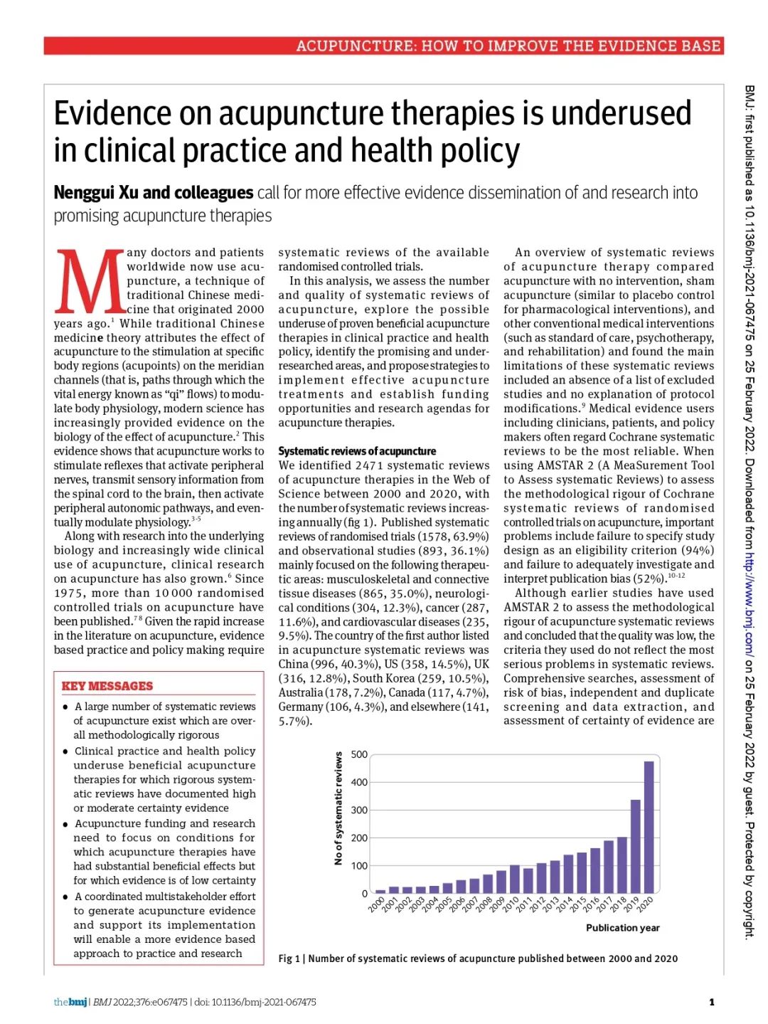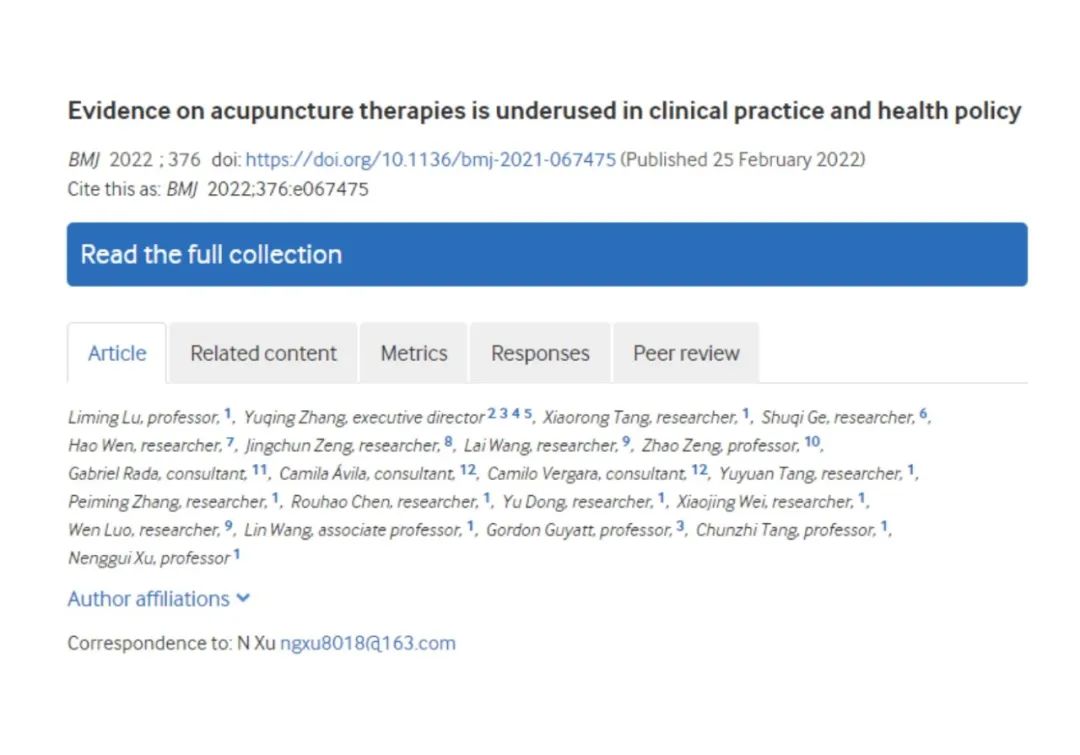 2月25日,我校许能贵教授团队在国际医学期刊《英国医学杂志》(BMJ,影响因子39.89)发表了题为“Evidence on acupuncturetherapies is underused in clinical practice and health policy”(基于临床证据体的针灸疾病图谱研究)的研究论文。