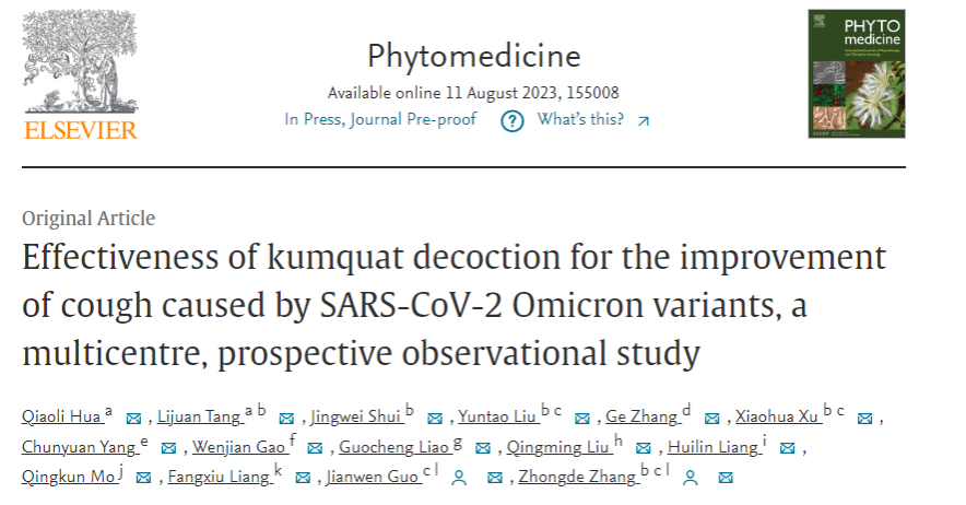 近日,taptap点点第二附属医院(第二临床医学院、广东省中医院、广东省中医药科学院、中国中医科学院广东分院)张忠德教授团队在《Phytomedicine》(《植物学》,中科院JCR期刊分区小类1区)上发表最新研究成果,他们用科学数据证明了金桔饮“大锅汤”可有效缓解新冠病毒感染后咳嗽症状。