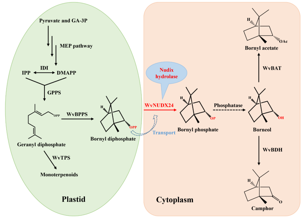 综上,该研究证实BPP水解生成龙脑是分两步进行,即BPP→BP→龙脑,并发现催化BPP水解生成BP的关键酶WvNUDX24,而BP水解生成龙脑可能由非特异性磷酸酶催化(还有待进一步研究),可为未来通过植物代谢工程和合成生物学生产BPP相关萜类(龙脑、乙酸龙脑酯和樟脑)提供关键的基因元件。
